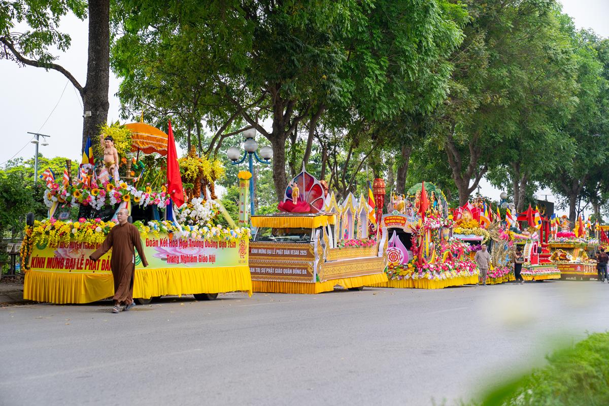 Pendant le Vesak, les pagodes vietnamiennes se parent de drapeaux bouddhistes, de lanternes colorées, de fleurs de lotus et de décorations solennelles. Des estrades cérémonielles sont installées pour accueillir prières, discours et célébrations officielles.