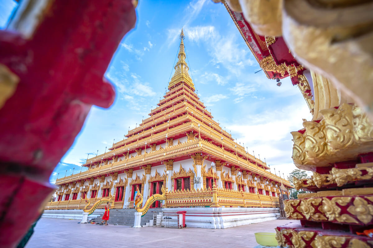 Dans l’après-midi, nous reprenons la route vers Ubon Ratchathani et visitons le Wat Phra That Nong Bua, remarquable pour son impressionnant stupa. Nous poursuivons avec le temple Supattanaram, avant de terminer par le Wat Thung Sri Muang, surprenant par son architecture mêlant harmonieusement les styles thaï, laotien et birman.