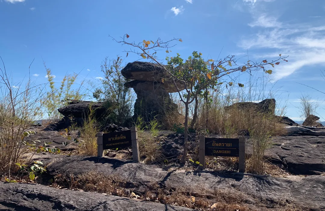 Après le petit-déjeuner à l’hôtel, nous prenons la route vers Kantharalak. De là, nous gagnons Pha Moh I-Daeng, facilement accessible depuis le parking après une courte montée. Situé à la frontière actuelle avec le Cambodge, ce site abrite désormais le mât de drapeau qui flottait autrefois sur Pei Ta Da. Depuis ce promontoire, nous profitons d’une vue spectaculaire sur la jungle cambodgienne, avec en perspective latérale le temple de Preah Vihear, dont les contours se confondent étonnamment avec la colline.