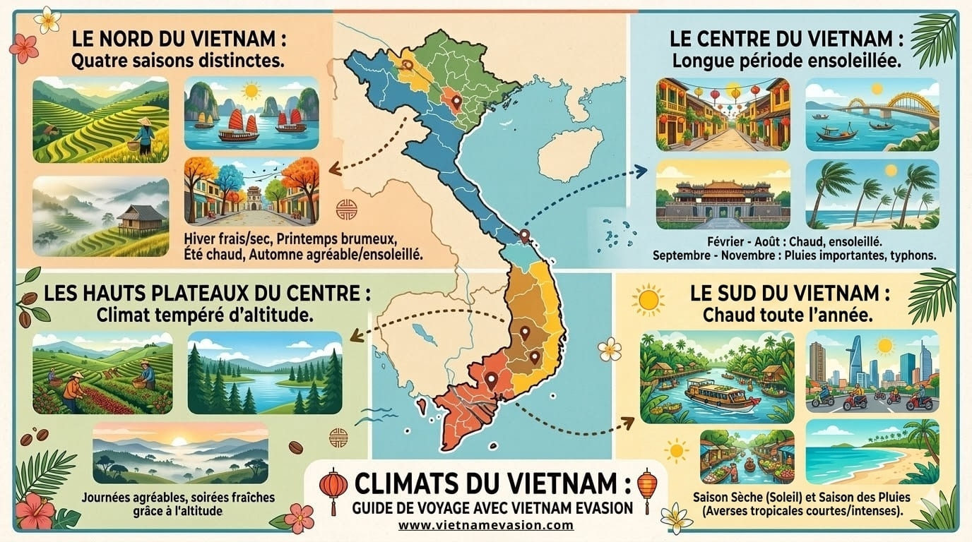 Le Vietnam se divise généralement en quatre grandes régions climatiques selon la géographie : le Nord, le Centre, les Hauts Plateaux du Centre et le Sud. Chaque zone possède ses propres saisons et particularités météorologiques.