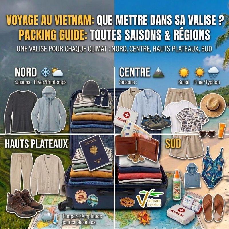 Pour profiter pleinement de votre séjour, il est donc essentiel d’adapter votre bagage. Voici un guide pratique pour faire sa valise pour un voyage au Vietnam, en tenant compte des saisons, des régions et des besoins des voyageurs.